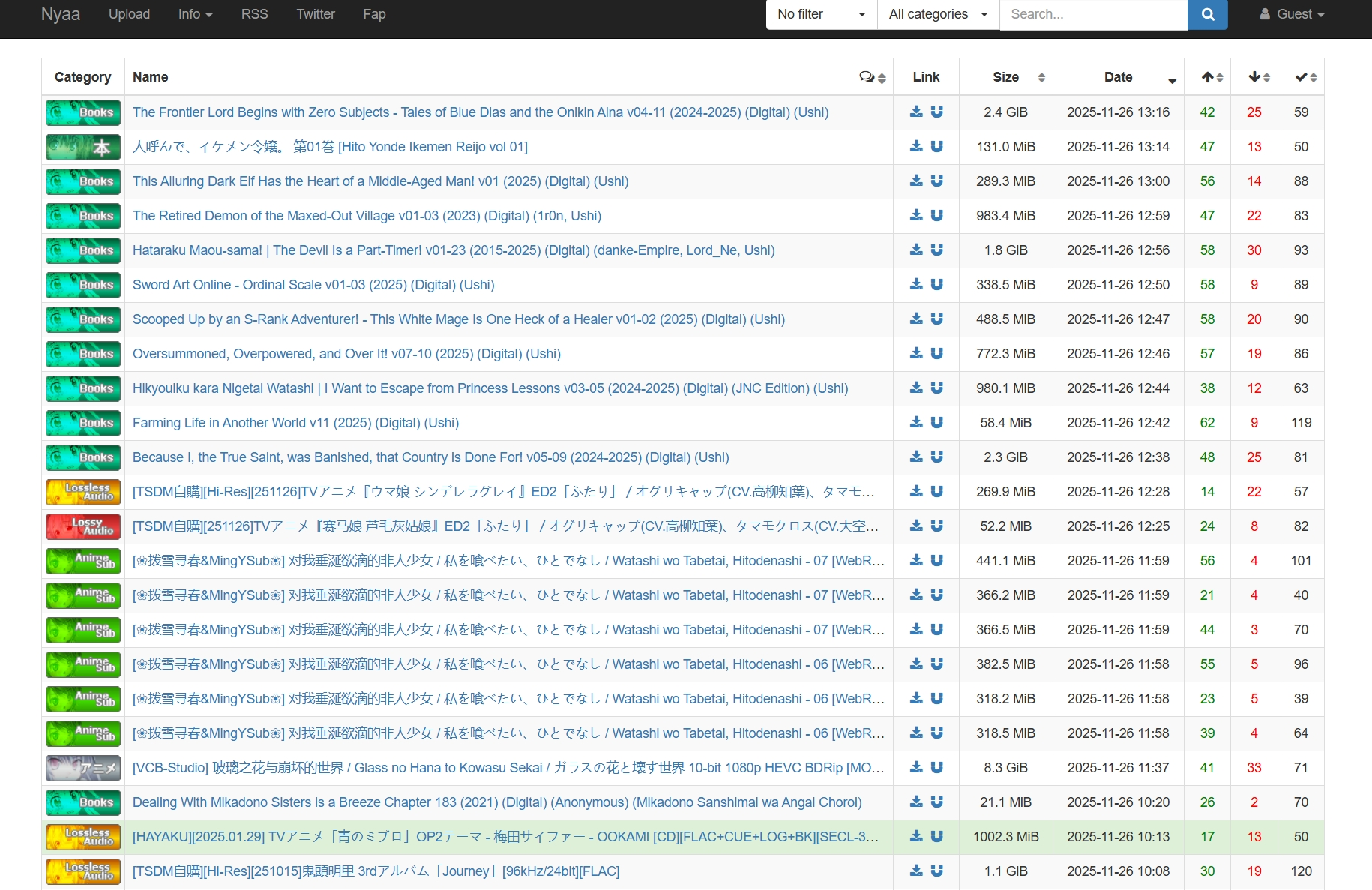 Nyaa.si 是一个以提供日本动漫资源下载为主的在线平台。该网站拥有广泛的用户群体,专注于分享各种动漫内容,包括最新的动漫剧集、电影、漫画以及相关的音频和视频文件。其通过种子(torrent)下载方式提供这些资源,用户可以方便地通过种子文件进行下载。